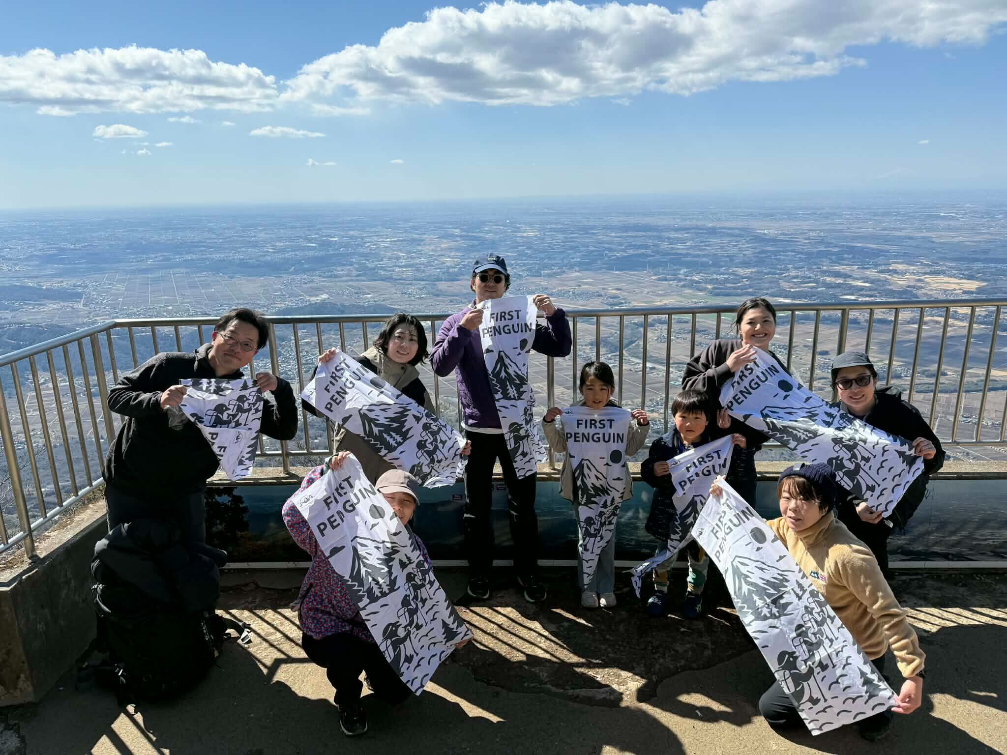 顔料インクジェットプリント、岡生地、90cmカットの手拭いです。 クラブでの初登山のお写真をいただきました。お天気も良く登山日和だったそうで、皆様の笑顔もとても輝いてみえます。白地に黒色の素敵なデザインの手拭いです。
