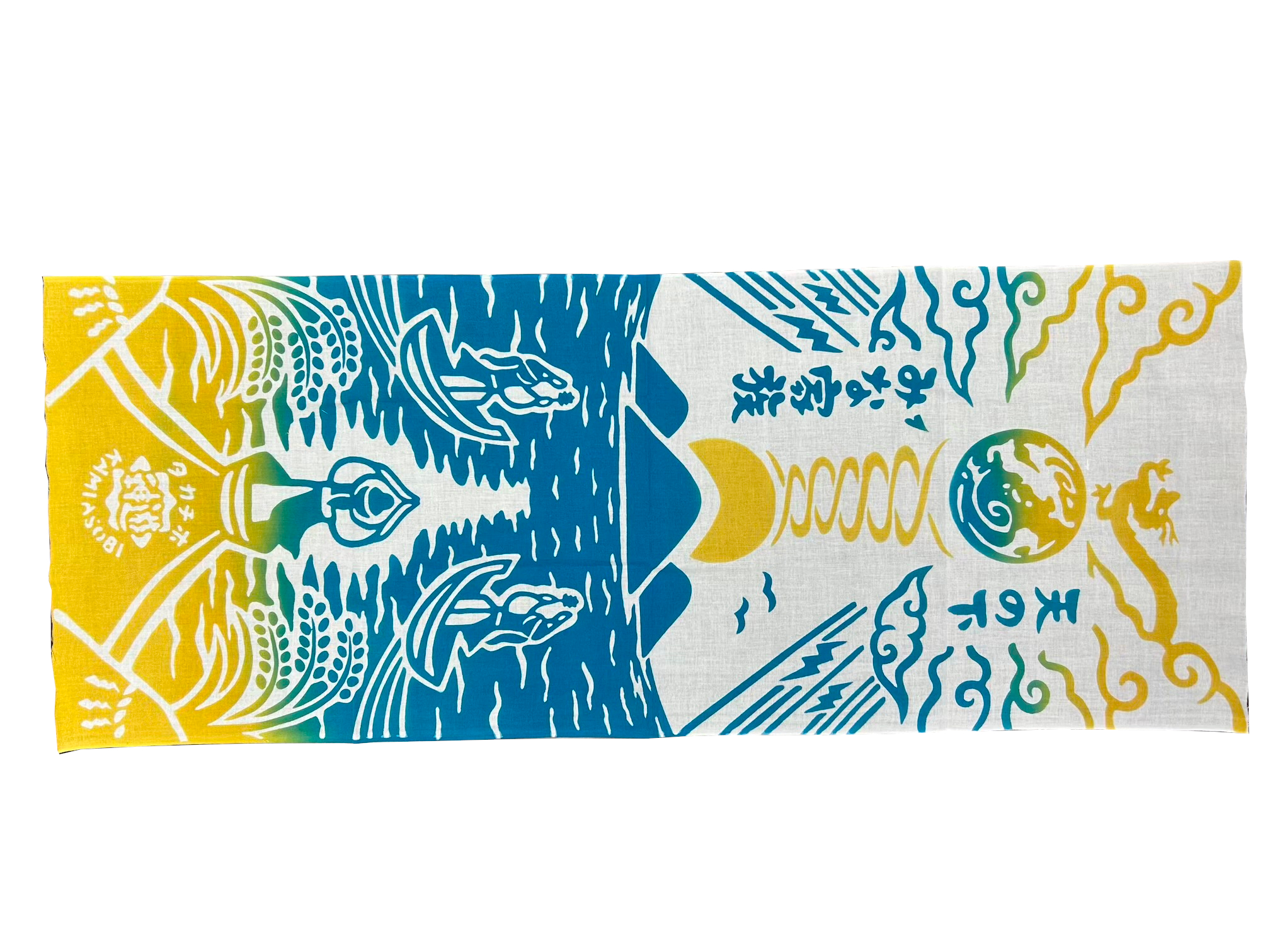 本染め(注染)で作成させていただいた手拭いになります。 黄色からブルーへのグラデーションが上手に再現できました。 注染でもこのようなグラデーションデザインで作成する事は可能ですので、お気軽にご相談ください。